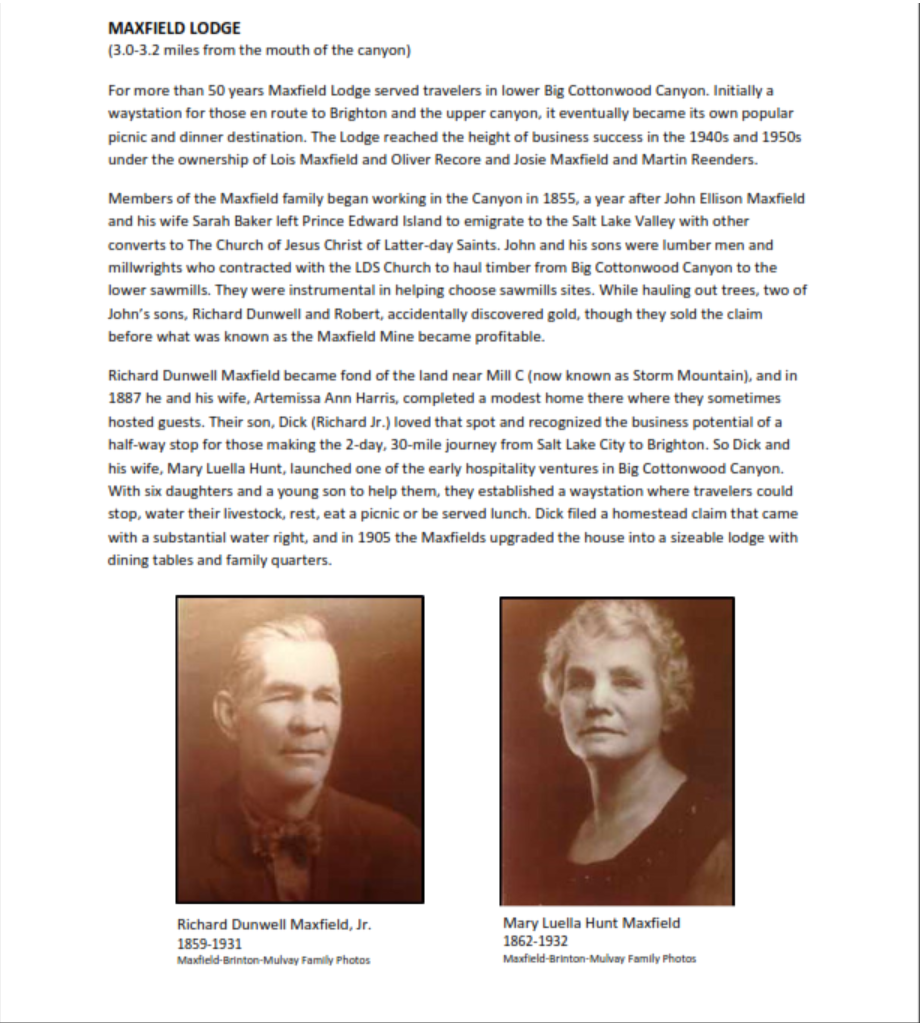 The Maxfield Family had been in the canyon since 1855 when brothers Richard and Robert, who arrived in Utah in 1851 from Prince Edward Island, Canada, began lumber mill work.[2] By 1870, the family had transitioned from lumber to mining as was common at that time. The family claimed water in 1895 and later homesteaded 80 acres, receiving a certificate in 1908. They built a home, a few cottages and campsites. The location was critical; a large, flat area adjacent to the creek just after an extremely steep uphill section. Animal teams hauling timber and later ore required rest, food and water here. There was no flat road through the Jones Rock until the 1916 cut. This natural place of respite was also a convenient half-way stop for people making the journey to and from Brighton. Sisters Lois and Josie Maxfield, born in 1885 and 1889, reminisced “People would come from the city in buggies or surries and spread their picnics on the ground. When it came time to return home, no attempt would be made to gather up and take back the huge amount of food that had been prepared. So after they left we children would raid the spot to see what remained. We have lugged home on a Sunday afternoon enough clean, unused food to last our family a week.”[3] By 1912, newspaper articles and advertisements appeared inviting people to the Maxfield Lodge Resort.[4]