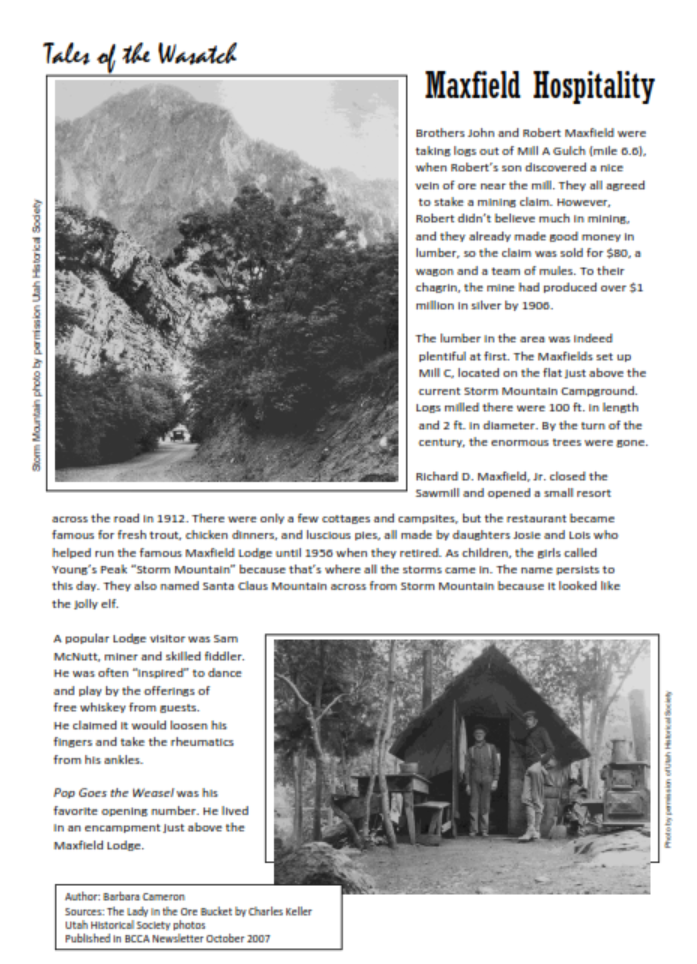 Now, only memories remain of the Maxfield Lodge Resort, but for decades it was a beloved spring and summer destination. In 1916, an advertisement in The Salt Lake Herald advised, “If you wish ‘a day off’ point the nose of your car towards this sylvan retreat in the Wasatch range at Maxfield lodge and return this evening in the moonlight with your mind and body refreshed and rested from the strain of busy days in the office. Take the ‘Maxfield Cure’ for ‘nerves.’”[1]