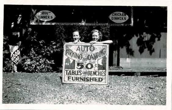 Photo Title: Young women employed at Maxfield Lodge announce services. Virginia Brinton, niece of Lois M. Recore and Jo (Josie) M. Reenders, on the right. Unknown woman on the left. Photo probably taken in the mid-1930s. Photo used with permission of Jill Derr.